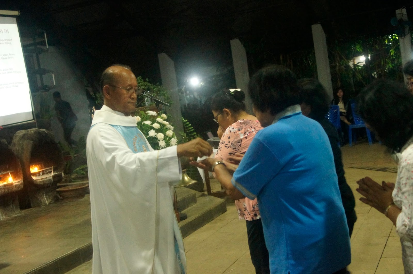 Pada pengantar Misa Romo Iwan megulas tentang Sikap Belas Kasih Bunda Maria yang tak terhingga, sehingga disetiap saat bagaimana Bunda Maria ini harus mendengarkan semua keluh kesah dan permohonan umatnya, namun Bunda Maria tetap sabar dan menyampaikan segalanya dengan sikap rendah hati semua permohonan dan keluh kesan itu kepada putranya yaitu Yesus Kristus. Bagaimana dengan sikap kita saat ini ?, apa bisa kita menerima kehadiran orang lain di dekat kita dengan segenap hati dan dengan penuh kelembutan tanpa rasa was-was, curiga dan menerima segala kekurangannya.... Sikap seperti itu saat ini semakin langka ditemui, bahkan cenderung sikap egois dan saling curiga terhadap orang lain , maka marilah kita mohon pertolongan bunda Maria sebagai pengantara segala Rahmat agar kita dengan sepenuh hati dan segala sikap kerendahan bisa menerima orang lain untuk hadir didalam hati kita.... diakhir Misa Pastor Iwan mengajak untuk refleksi batin melalui sebuah perenungan dalam Adorasi untuk mohon rahmat atas perbaikan segala sikap kita agar lebih baik seperti yang telah diteladankan oleh Bunda Maria.....